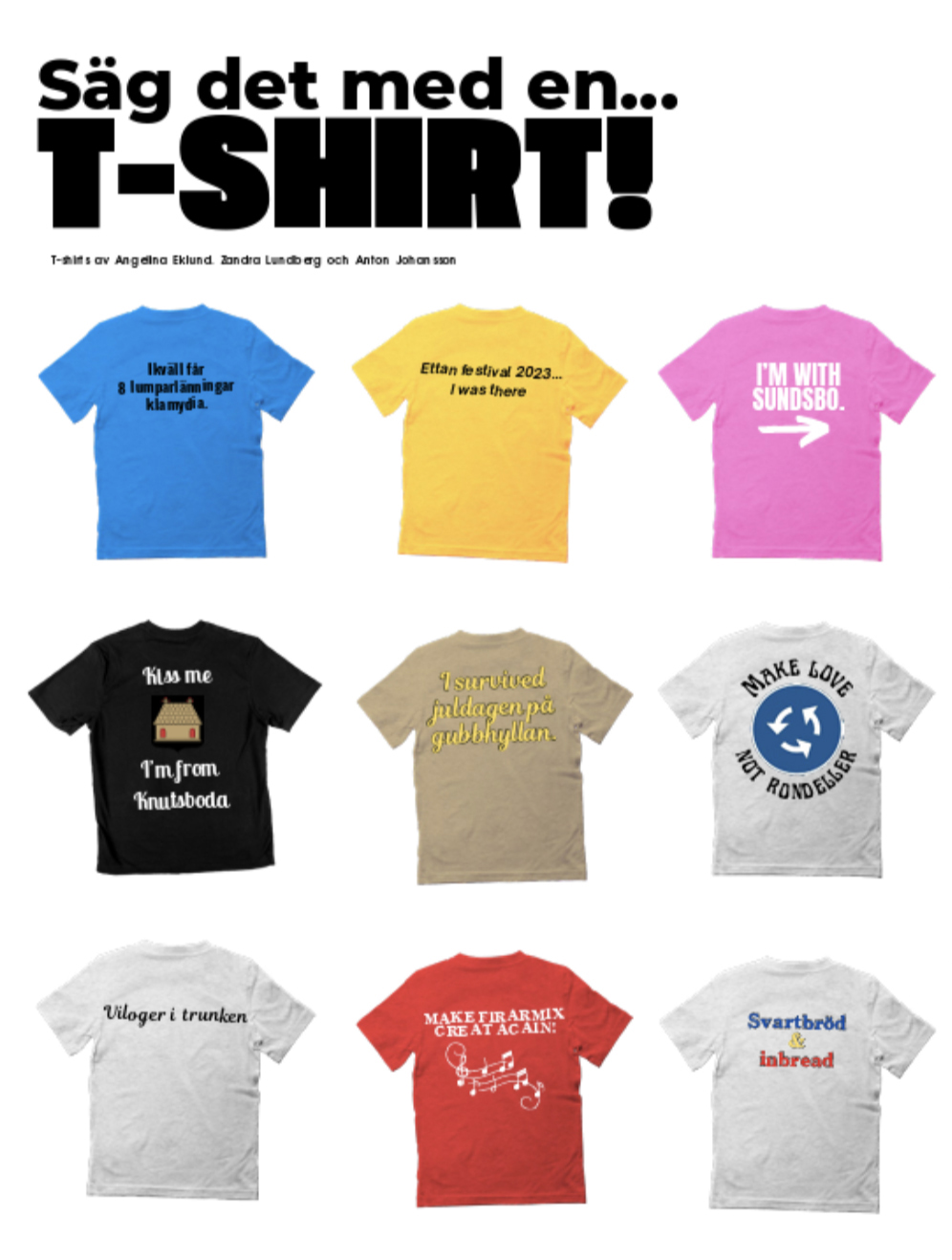 Lokal humor finns det också plats för. Här en samling t-skjortor med åländska ungdomsteman.